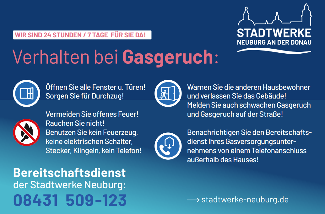 Als weitere Sicherheitseinrichtung sind bei den Stadtwerken Neuburg an der Donau alle Hausanschlüsse mit außenliegenden Absperreinrichtungen versehen. Seit 2005 werden Strömungswächter in jeden Hausanschluss eingebaut. Bei unkontrolliertem Austritt von größeren Mengen Gas schließt diese die Leitung sofort. Auf Anfrage erhalten Sie von uns kostenlos einen „Geruchsflyer“, mit welchem Sie den Geruchsstoff testen können.